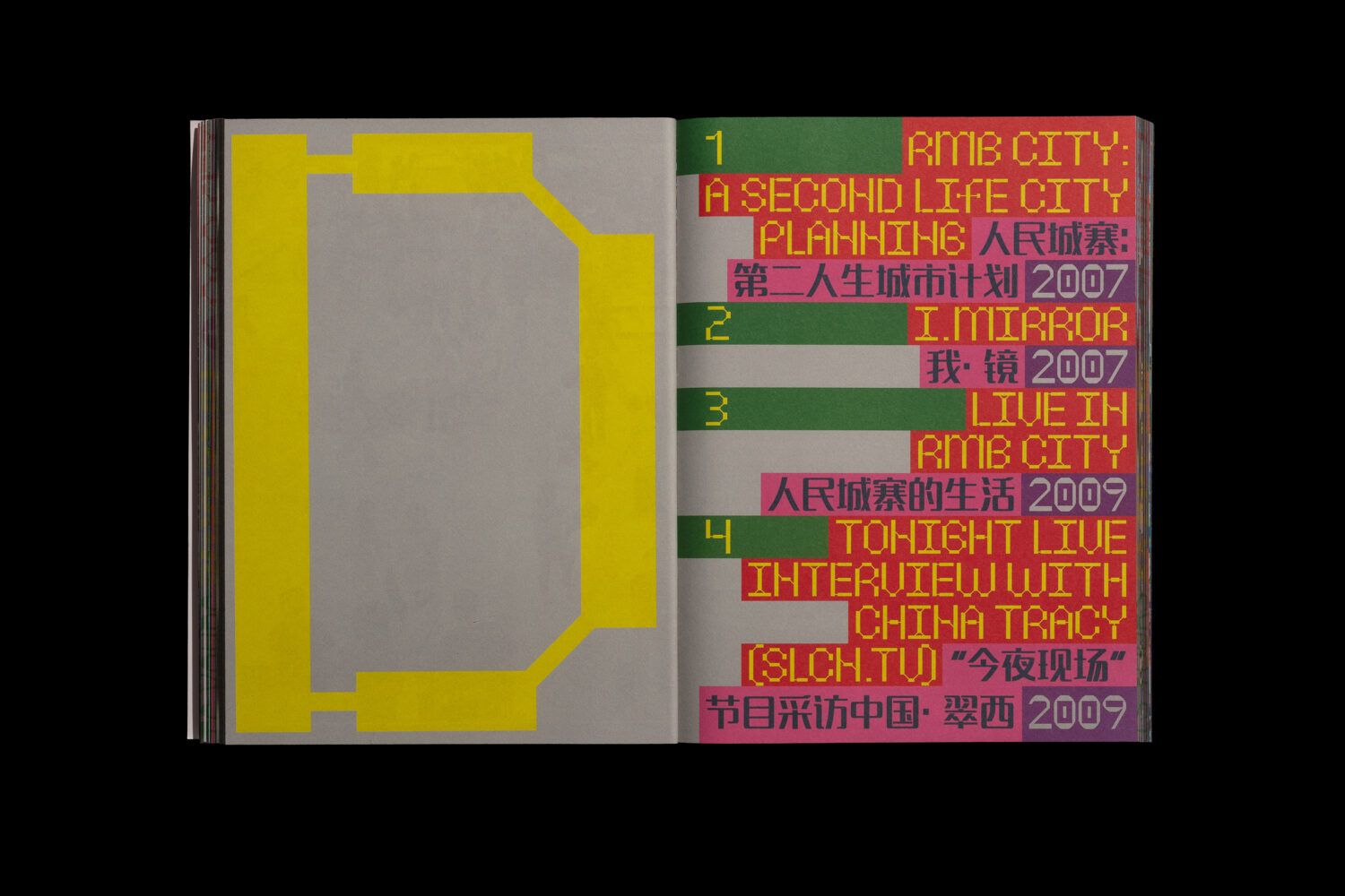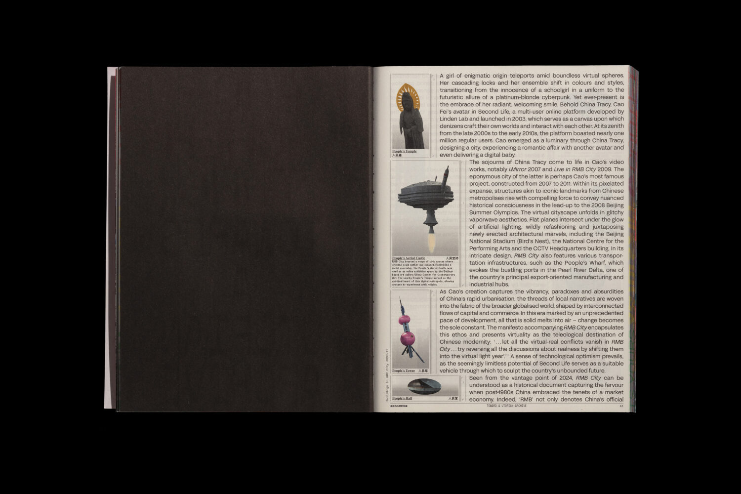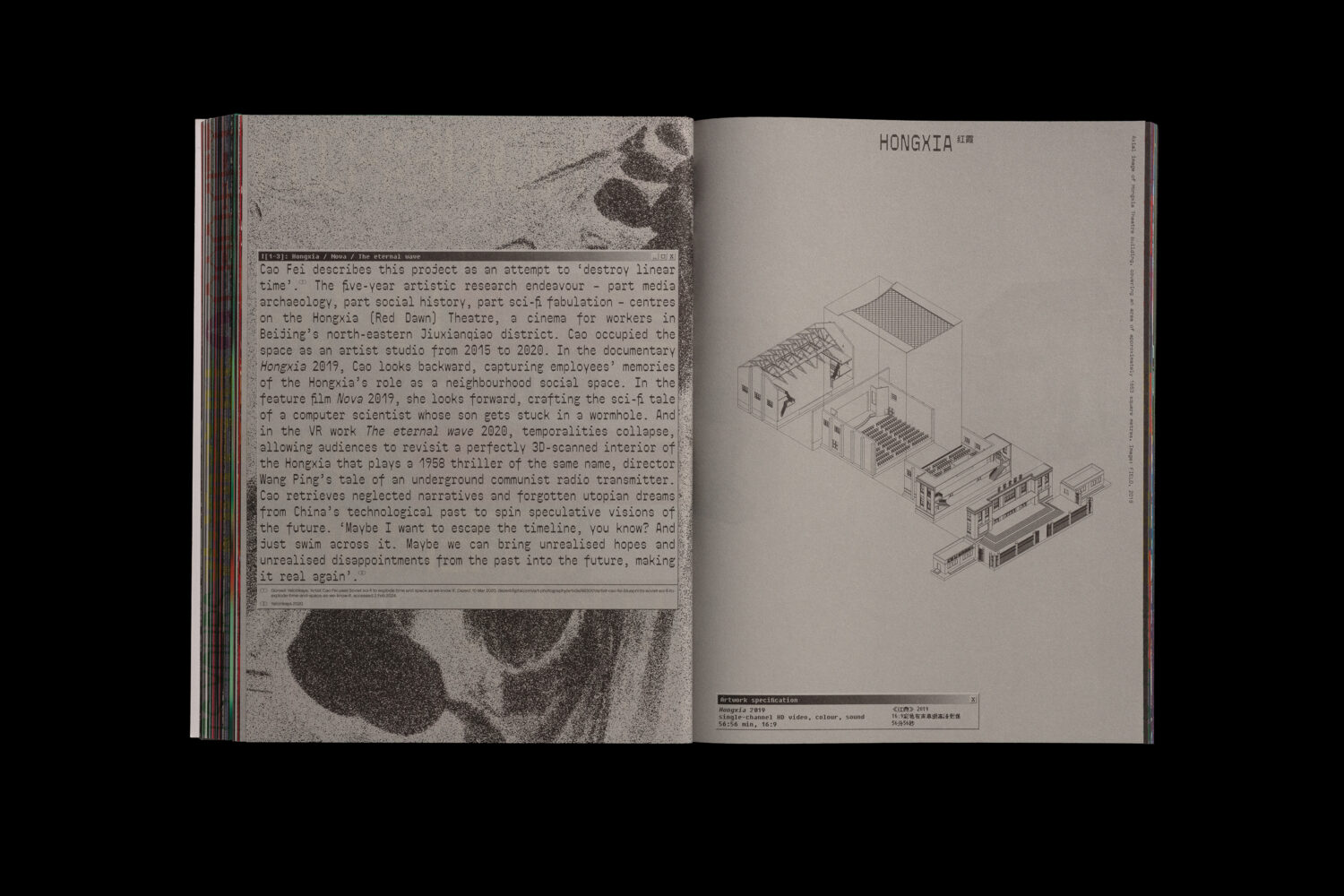 The design concept was driven by the desire to create an object of futuristic optimism, crafted to represent Cao Fei’s belief and to blur the language of print and digital aesthetics. Every typeface chosen, icons created and any decorative aesthetics are representations of the worlds the catalogue is trying to represent: Cao Fei’s virtual worlds, the dilapidating dormant Sydney China Town and the emotive spaces in between through the lens of the artist. The expressions are delivered through cohesions of graphics, materiality and content curation.