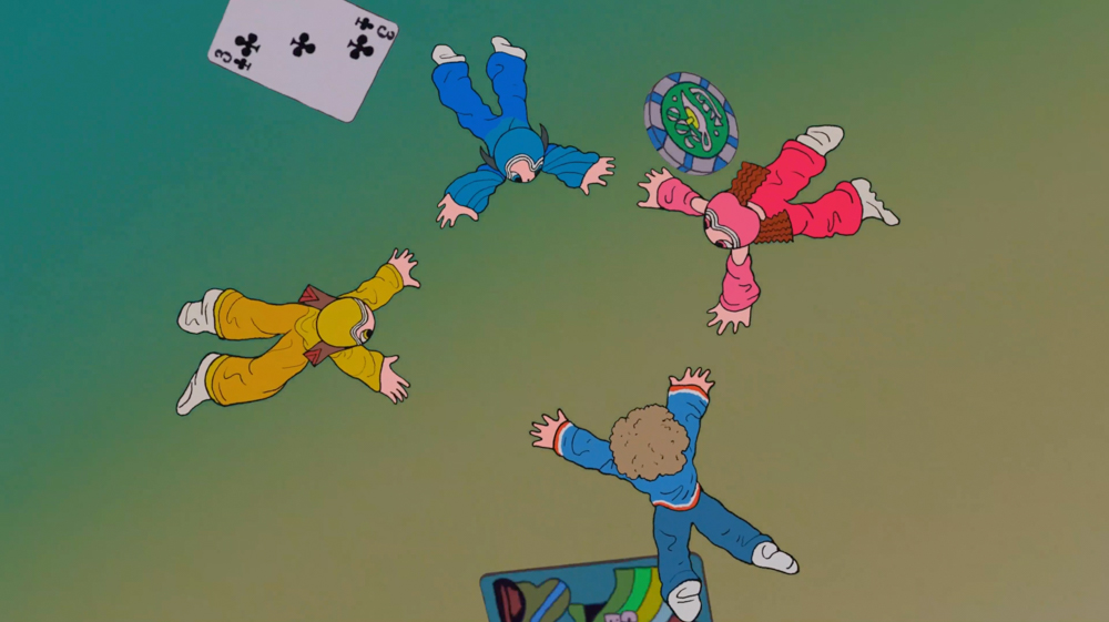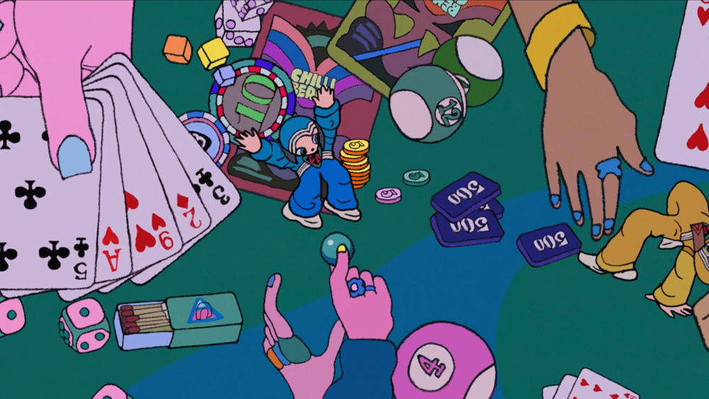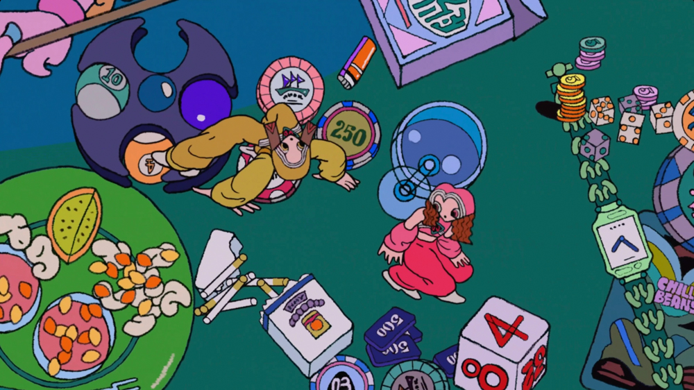 Inspired by a song that evokes both the emptiness of love and extravagant parties and the irresistible allure they carry, the work uses a casino motif to create an addictive animation imbued with a sense of tension and lurking dread.