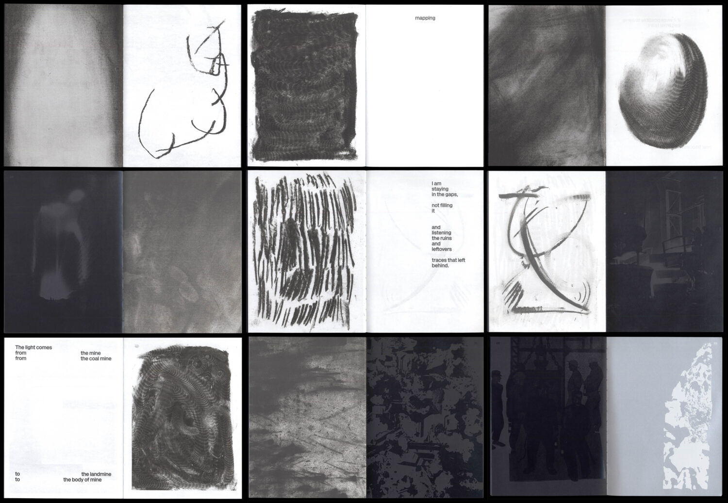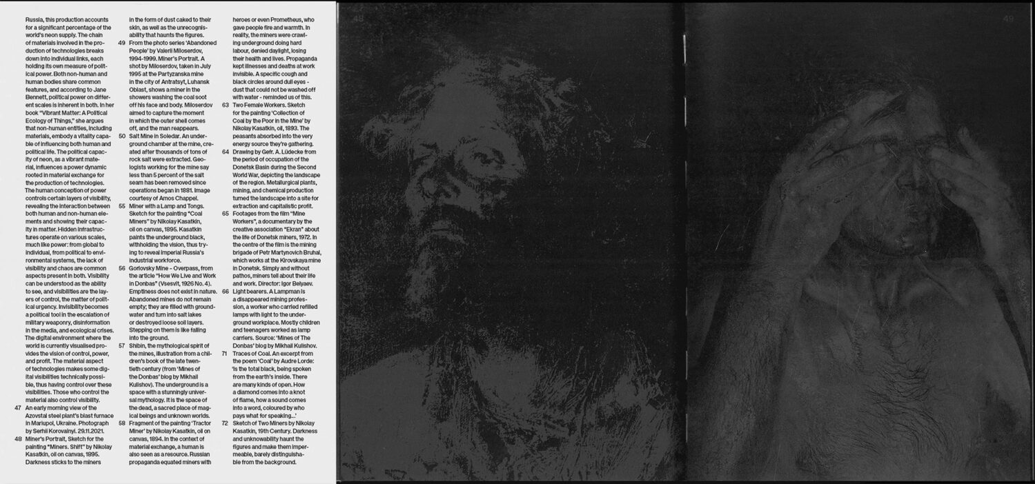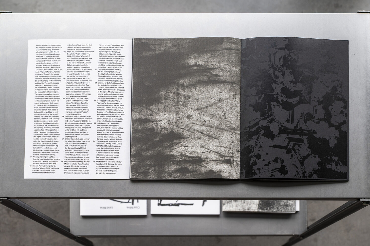 The publication features black images printed on black paper, intentionally withholding visibility of the industrial workforce and the geopolitical forces that shaped them, echoing the silence and erasure at the heart of extractive histories.