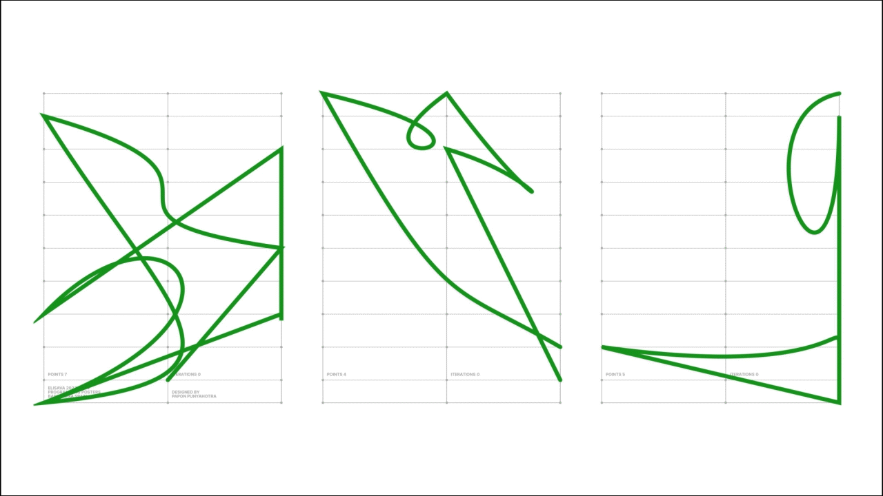 While setting the parameters for the system I focused on exploring three main guidelines, the proportions, the aesthetic of the form itself, and complexity of the shape. I first decided on a simple grid, using proportions you would use for a regular typeface. Secondly, I experimented with fills and strokes, the strokes worked best since they provided a more breathable form compared to the filled shapes. Finally, I experimented with the complexity of each shape via the number of points plotted. I found that 3 – 7 points worked best as it allowed for both simple and complex forms to be generated. The final system consists of a 3 by 11 grid and the fixed number of points. The points plotted on the grid were connected with a straight line or a bezier curve at random. This allowed for curved forms as well as straight geometric lines. By using this system I generated 1,000 forms each for 3, 4, 5, 6, and 7 points, making a total of 5,000 forms.