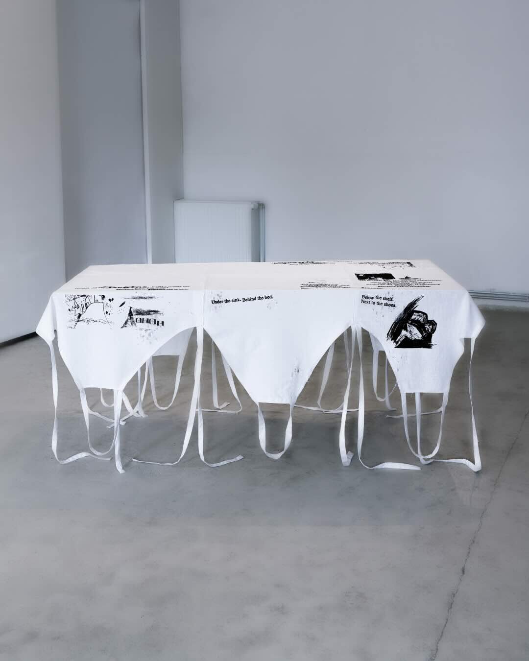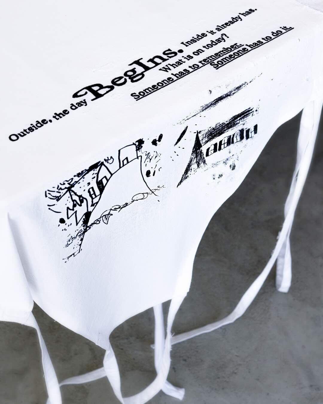 holding, (shift)ing brings invisible, gendered labour to the table — the kind that holds everyday life together: care work, mental load, and domestic tasks. At the centre of the installation lies a large tablecloth made from seven white aprons. Sewn from linen and cotton, these aprons are embroidered with a cyclical poem and printed with childhood drawings. They do not merely decorate the table — they carry it. By reappropriating sewing and embroidery as feminist strategies, and reclaiming the apron as both symbol and structure, the work opens up space for reflection on care, responsibility, and social roles.