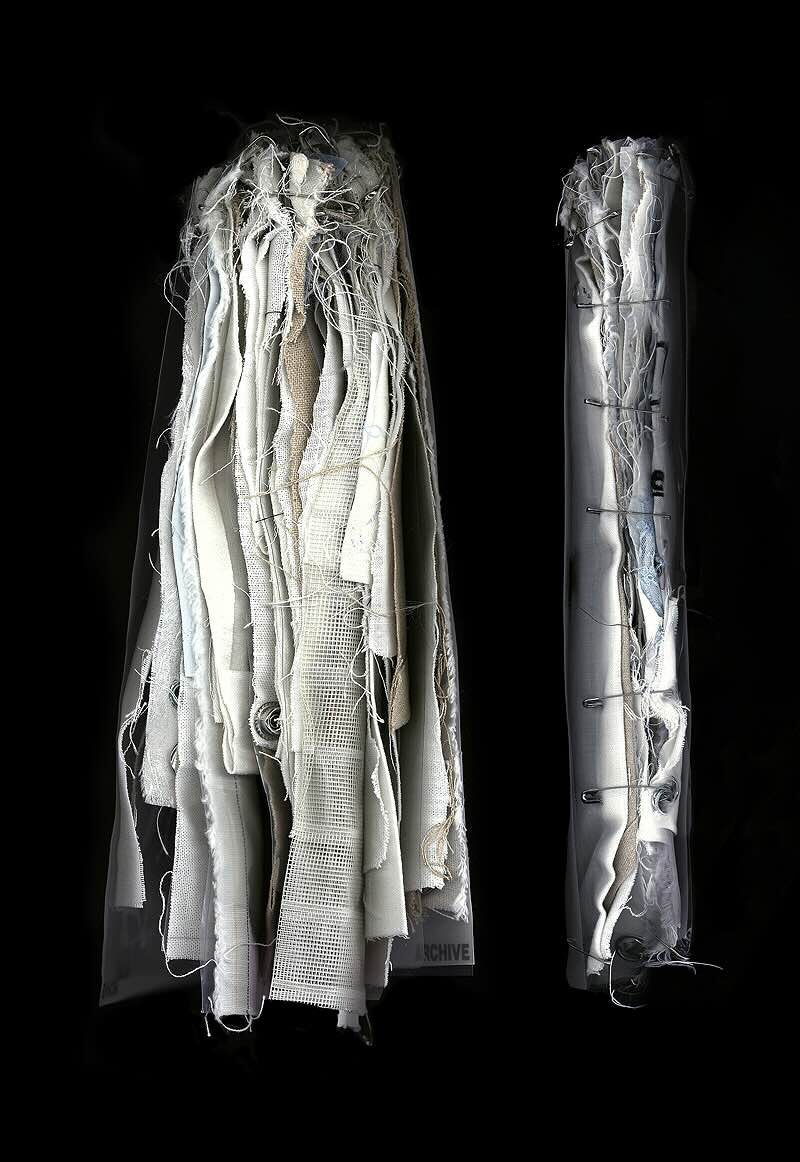 Accompanying the tablecloth is a process-based archive, which serves as a physical record of the labour behind the work. This book-like object reveals otherwise invisible parts of the creation process: textile tests, material remnants, and intermediate stages. It exclusively uses materials that were part of the making — fabrics, threads, eyelets, pins, and screen-printing foils. The archive’s cover lies loosely on top; it is held together by its inner layers. This structural choice is symbolic: what carries often remains hidden. Rather than functioning as supplementary material, the archive stands as an independent work of design and care.