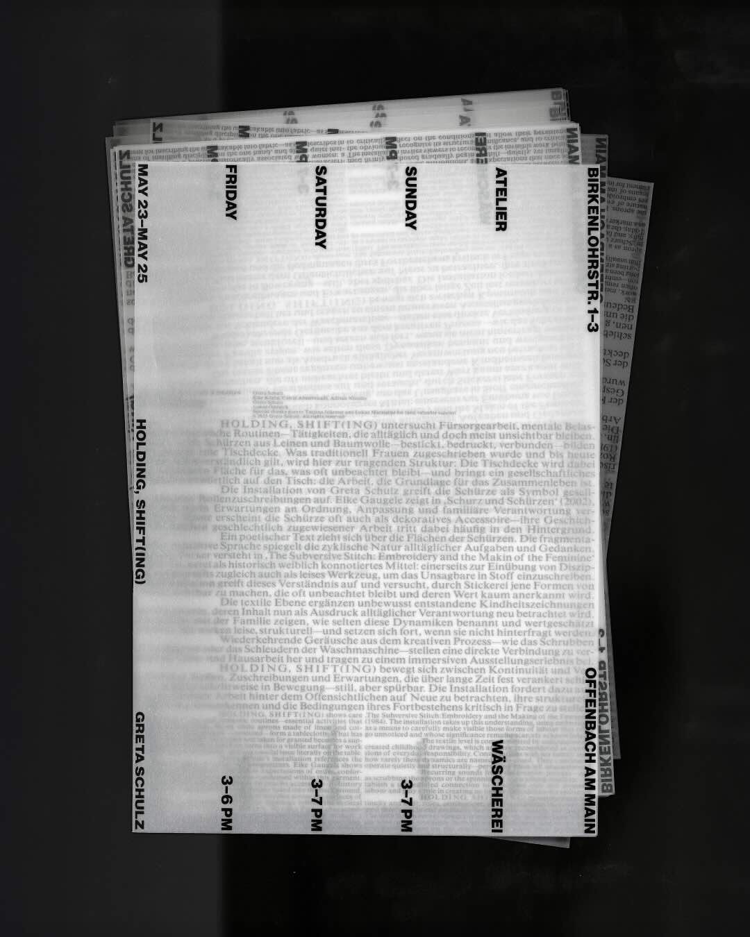 The flyer, printed on translucent paper, makes visibility and layering symbolically tangible. The title holding, (shift)ing is placed at the center — where the flyer is held — marking the act of “holding.” A rotation in reading direction mirrors the idea of “shifting.” When unfolded, the flyer reveals weight on the inside — like the kind of labour that remains unseen but supports everything. Rotated, it also functions as a poster. A delicate serif text block supports bold display type, forming a visual metaphor for the tension between the visible and the invisible.