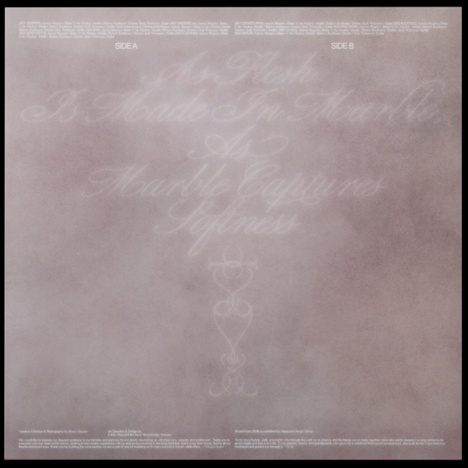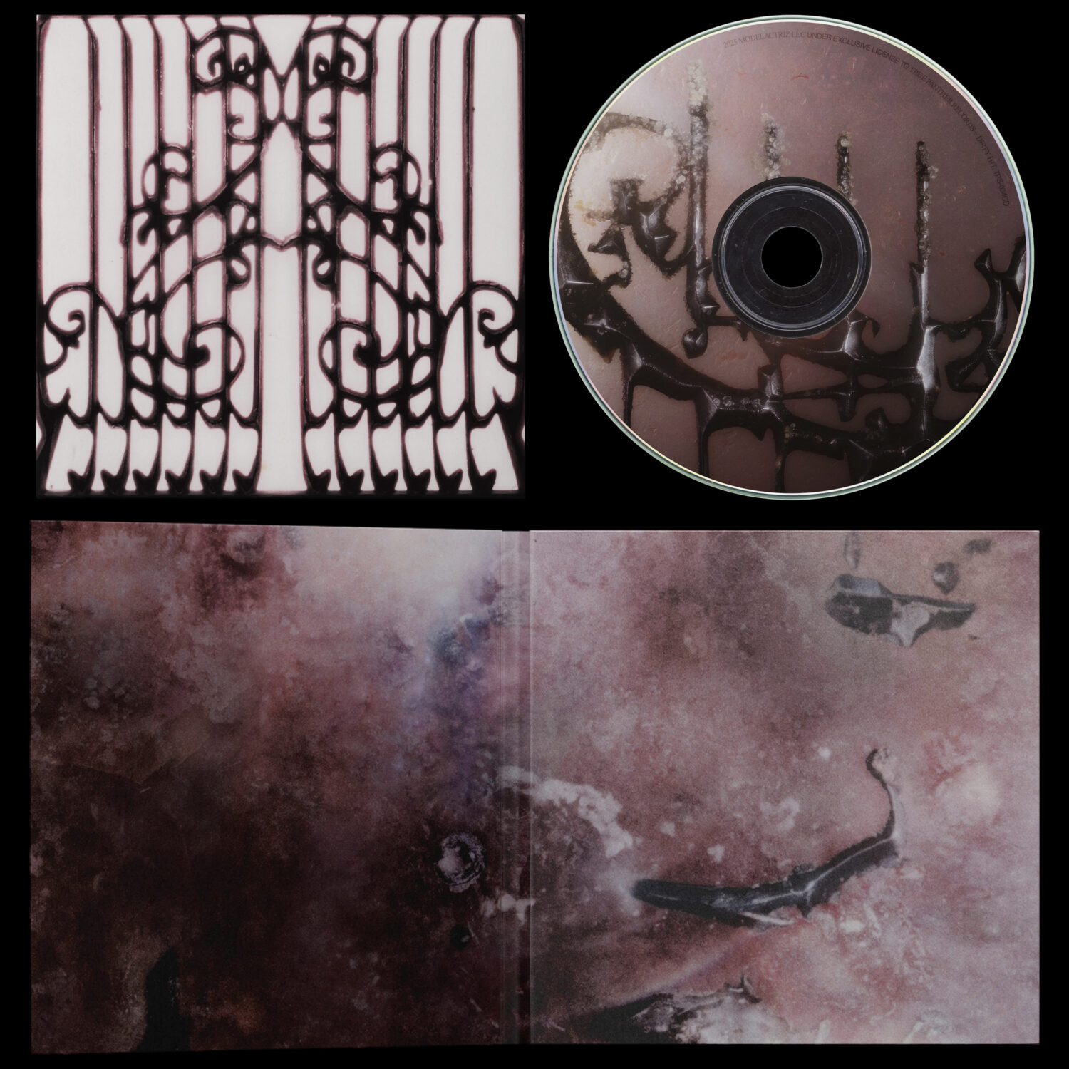 Our approach to the visual world of “Pirouette” consisted of equal parts digital tinkering and real-world capture. Our goal was to harken on the material ethos of the album which consisted of marble, flesh, metal, and light. We wanted the art to feel operatic and feminine while maintaining a subconscious carnal feel. We utilized macro photography of the blood vessels in our inner lips as well as scans of raw meat, fish scales and bones. We then combined these with miniature gate imagery (by Rusty Snyder) and composed digital “collages” with all of these pieces. We also wanted to mix a strong sans serif type lockup with wispy script moments to further push this abrasive yet delicate direction.