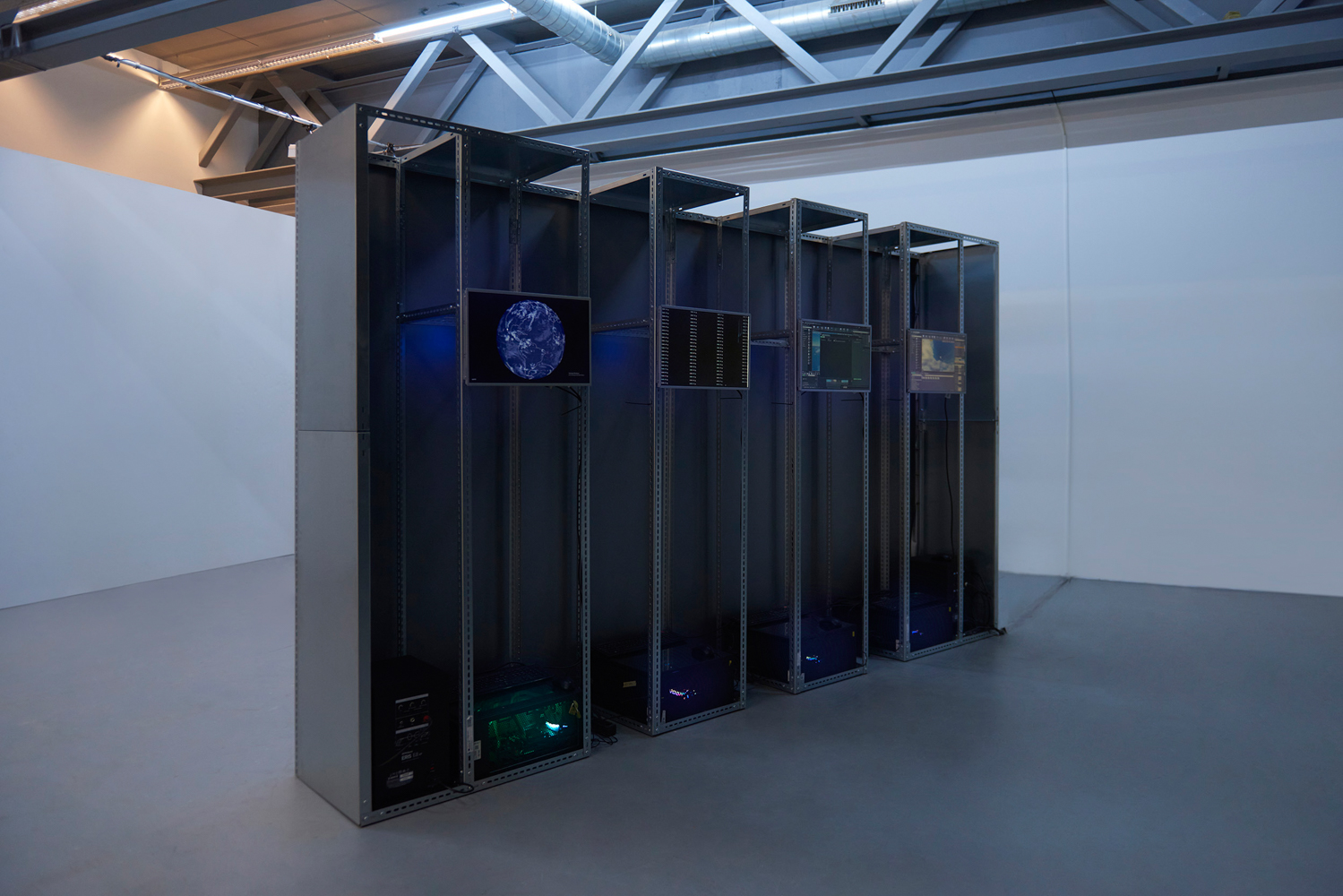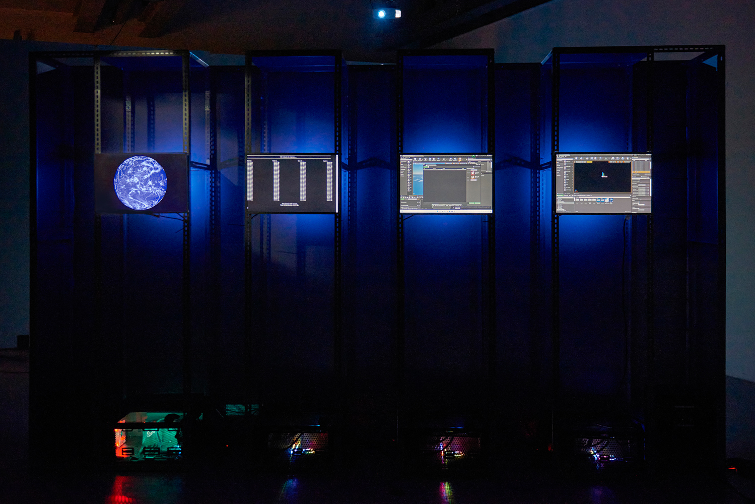 The installation is constructed within a metallic rectangular cuboid frame measuring 360cm × 220cm × 50cm. A large display screen mounted on the front serves as the primary visual interface, while the rear houses four computer units and auxiliary monitors that form the integrated technical support system.