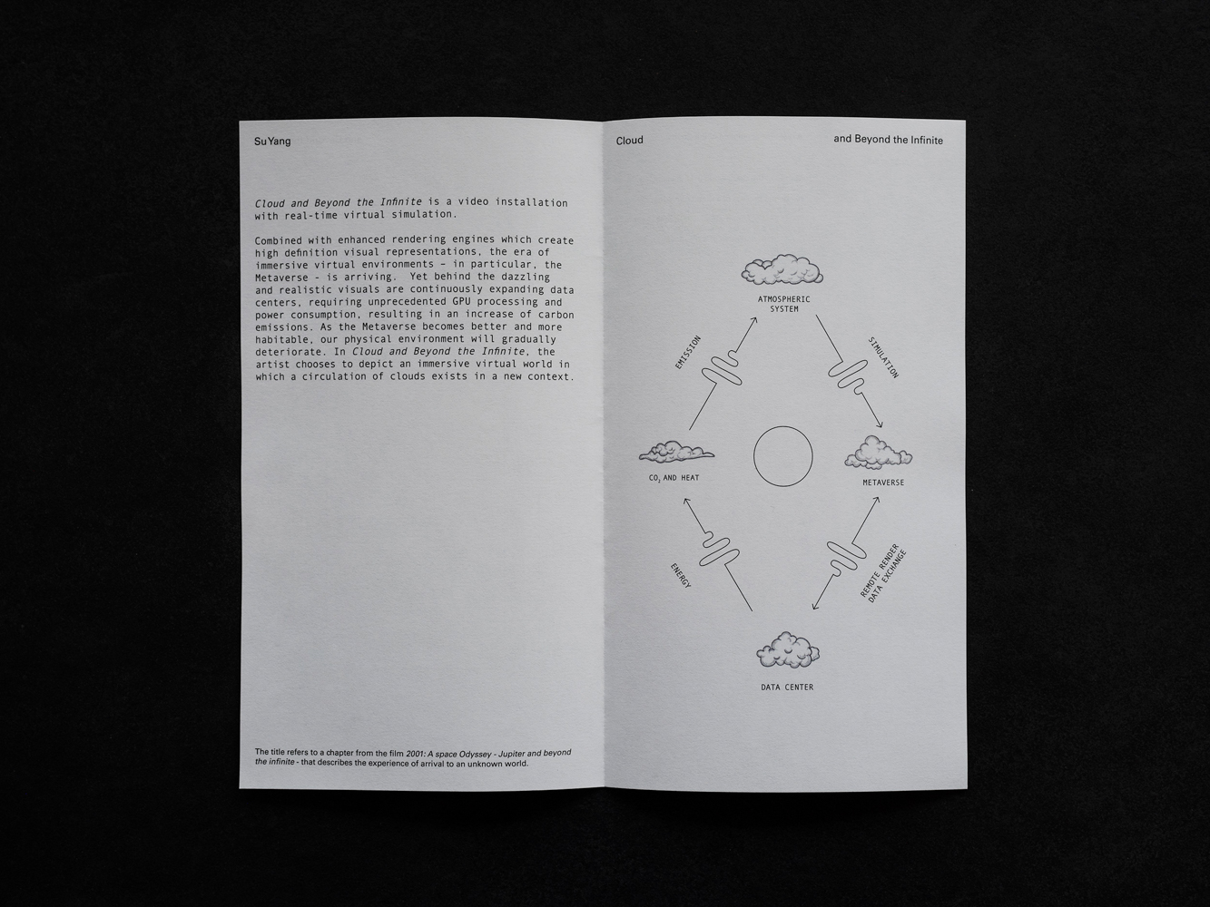 Through 3D simulation and real-time rendering technologies, the piece constructs a conceptual cycle around the “Cloud”: natural clouds are simulated and transformed into the digital world stored in the new Cloud (data centers), while the carbon emissions generated by digital storage in turn affect the atmospheric environment. This creates a closed-loop system that moves from nature to the digital world, and back again to nature.